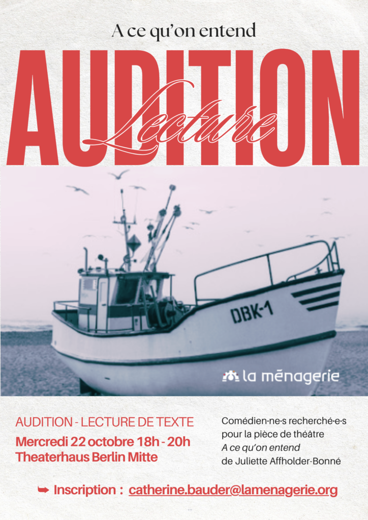 La Ménagerie recherche des comédien·ne·s pour la pièce de théâtre : À ce qu’on entend écrite par Juliette Affholder-Bonné et mise en scène par Catherine Bauder, Yolène Salvan et Pauline Varet.